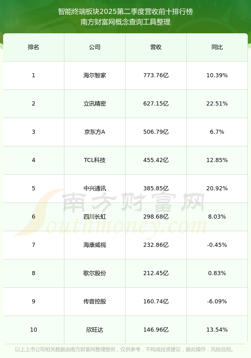 按照南方財富網(wǎng)概念查詢工具統(tǒng)計,該股所屬板塊為智能終端板塊,該板塊共有53只股票,聞泰科技2025第二季度營收在該板塊中排名為第53名,該板塊2025第二季度營收排名前十的股票如下表: