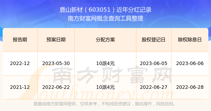 鹿山新材最新一次公布的分紅方案為10派4元。本次權益分派股權登記日為2023年6月5日,除權除息日為2023年6月6日,派息日為2023年6月6日。