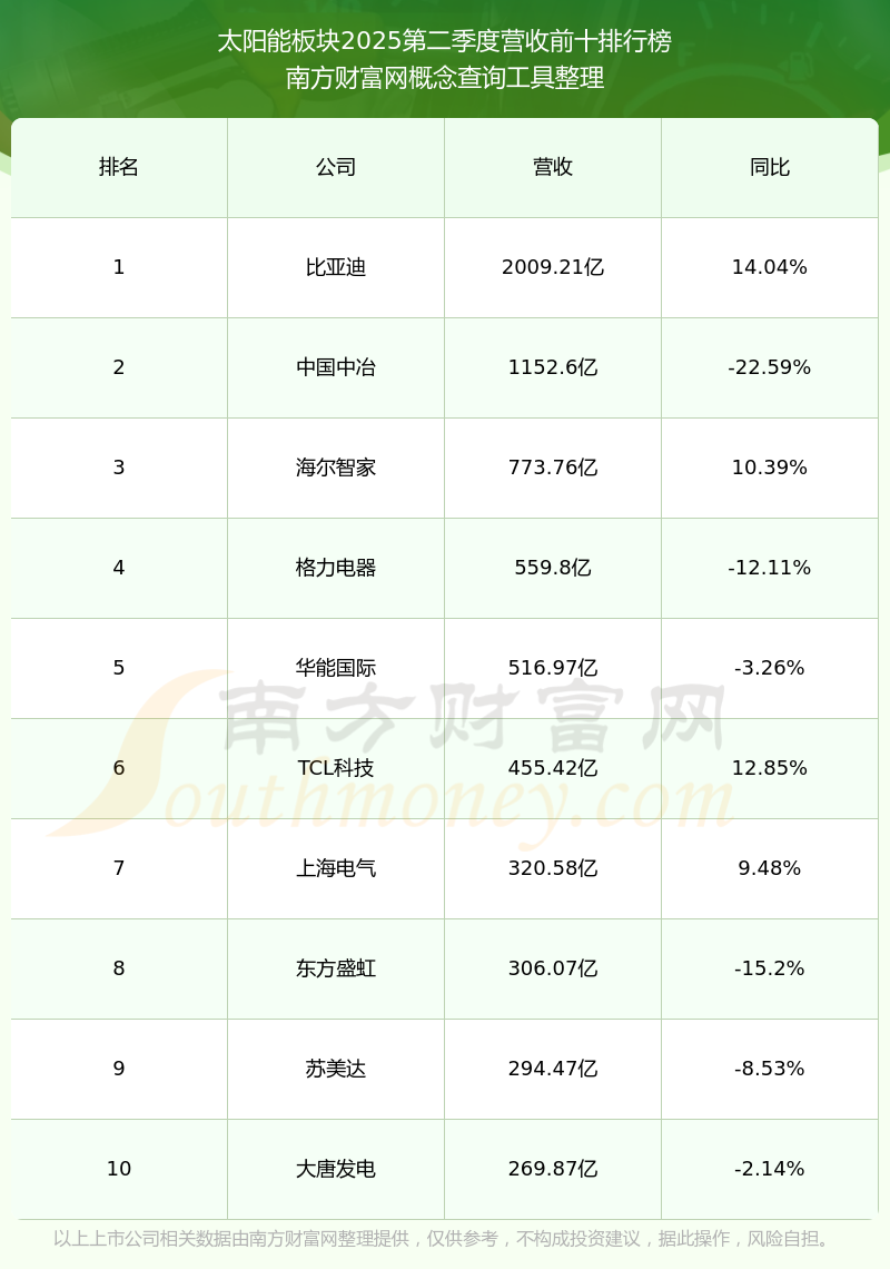 按照南方財(cái)富網(wǎng)概念查詢工具統(tǒng)計(jì),該股所屬板塊為太陽(yáng)能板塊,該板塊共有448只股票,億晶光電2025第二季度營(yíng)收在該板塊中排名為第271名,該板塊2025第二季度營(yíng)收排名前十的股票如下表: