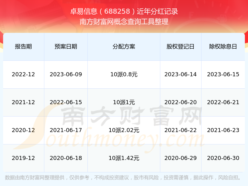 卓易信息最新一次公布的分紅方案為10派0.8元。本次權(quán)益分派股權(quán)登記日為2023年6月14日,除權(quán)除息日為2023年6月15日,派息日為2023年6月15日。