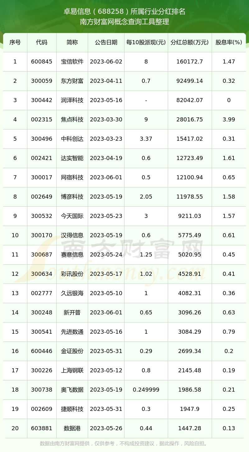 按照南方財富網(wǎng)趨勢選股系統(tǒng)統(tǒng)計,卓易信息所屬行業(yè)為云計算行業(yè),云計算行業(yè)分紅排名情況如下表: