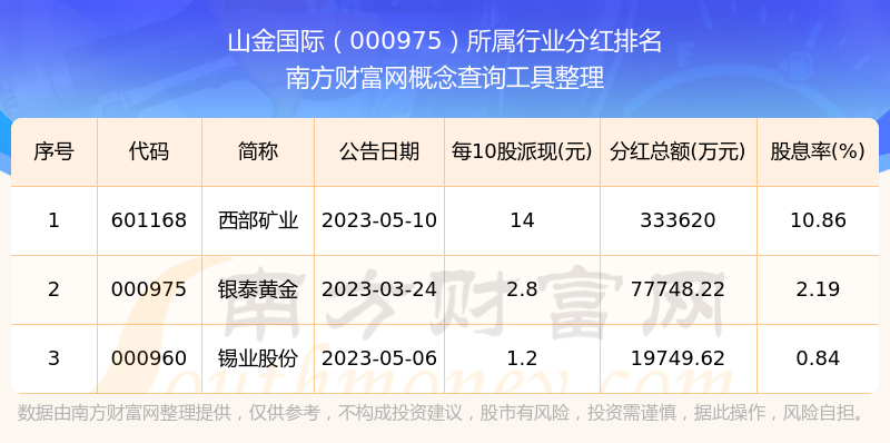 按照南方財(cái)富網(wǎng)趨勢(shì)選股系統(tǒng)統(tǒng)計(jì),山金國(guó)際所屬行業(yè)為黃金行業(yè),黃金行業(yè)分紅排名情況如下表: