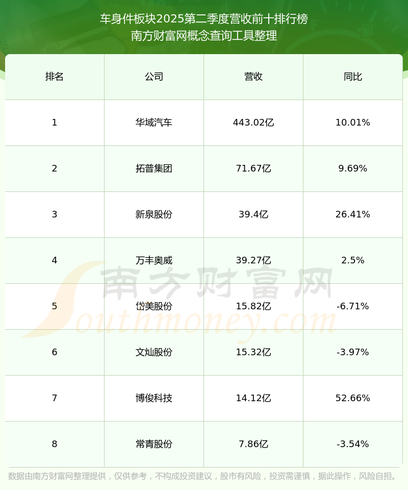 按照南方財(cái)富網(wǎng)概念查詢工具統(tǒng)計(jì),該股所屬板塊為車身件板塊,該板塊共有8只股票,金龍汽車2025第二季度營(yíng)收在該板塊中排名為第8名,該板塊2025第二季度營(yíng)收排名前十的股票如下表: