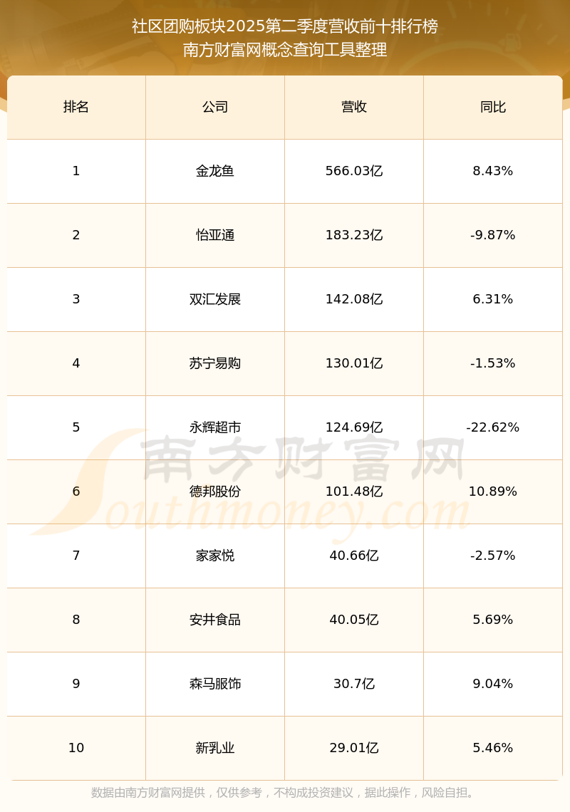 按照南方財(cái)富網(wǎng)概念查詢工具統(tǒng)計(jì),該股所屬板塊為社區(qū)團(tuán)購板塊,該板塊共有53只股票,家家悅2025第二季度營收在該板塊中排名為第7名,該板塊2025第二季度營收排名前十的股票如下表: