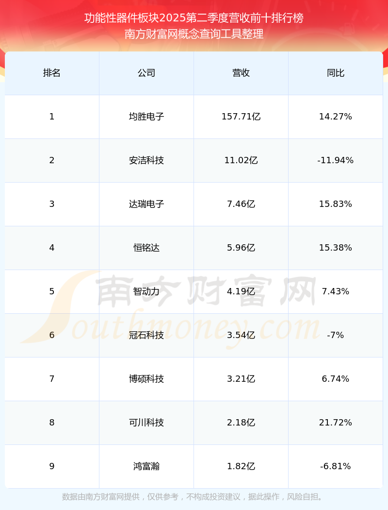 按照南方財(cái)富網(wǎng)概念查詢工具統(tǒng)計(jì),該股所屬板塊為功能性器件板塊,該板塊共有9只股票,可川科技2025第二季度營收在該板塊中排名為第8名,該板塊2025第二季度營收排名前十的股票如下表: