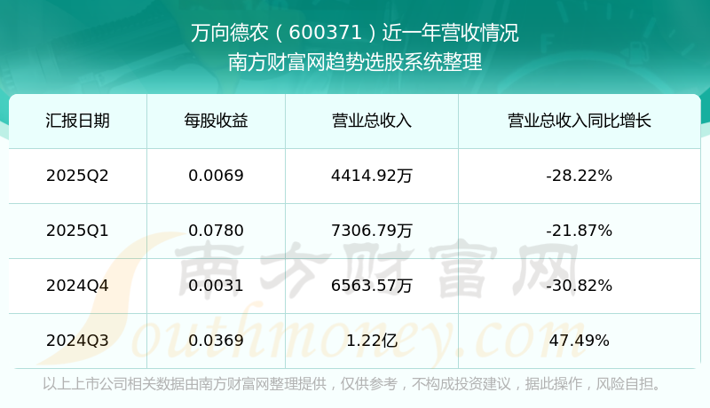 萬向德農(nóng)披露了2025年第二季度財報。報告顯示,萬向德農(nóng)2025年第二季度實現(xiàn)營收4414.92萬元,同比-28.22%;歸母凈利潤217.34萬元,同比-65.96%。