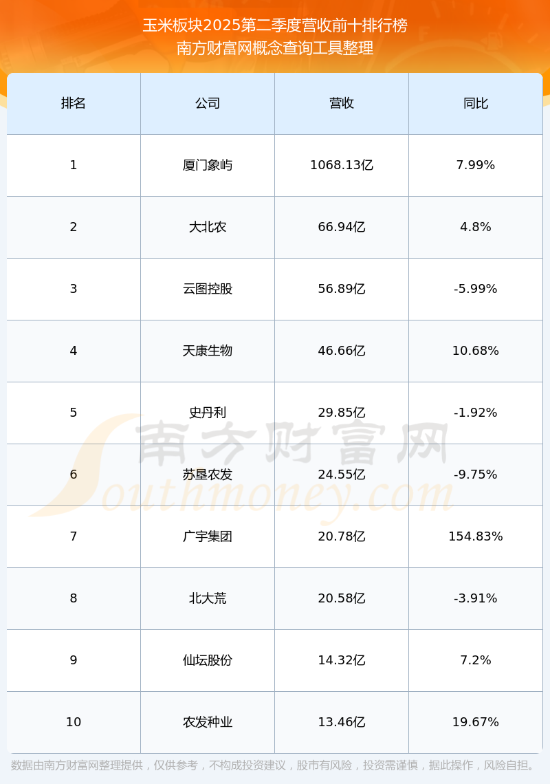 按照南方財富網(wǎng)概念查詢工具統(tǒng)計,該股所屬板塊為玉米板塊,該板塊共有20只股票,萬向德農(nóng)2025第二季度營收在該板塊中排名為第20名,該板塊2025第二季度營收排名前十的股票如下表: