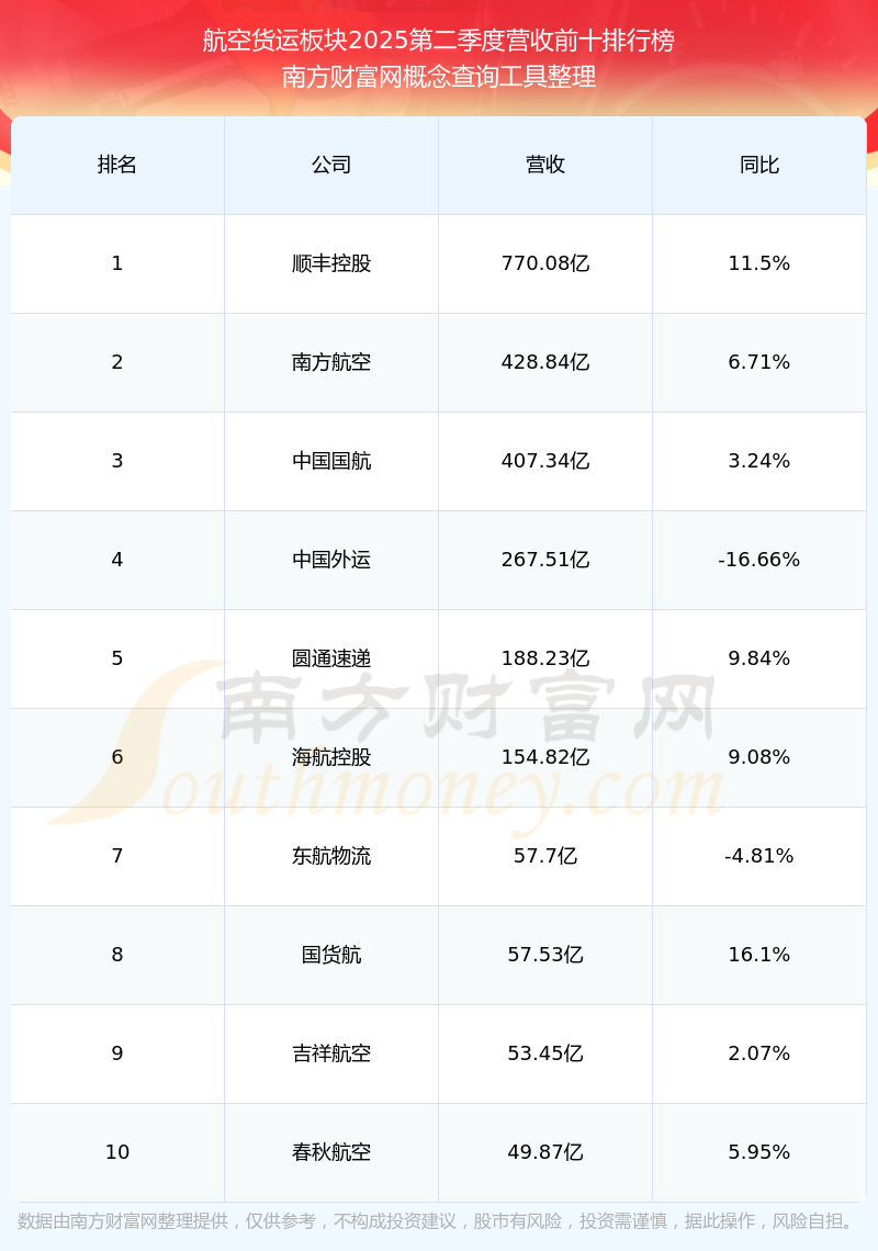 按照南方財(cái)富網(wǎng)概念查詢工具統(tǒng)計(jì),該股所屬板塊為航空貨運(yùn)板塊,該板塊共有15只股票,中國國航2025第二季度營收在該板塊中排名為第3名,該板塊2025第二季度營收排名前十的股票如下表: