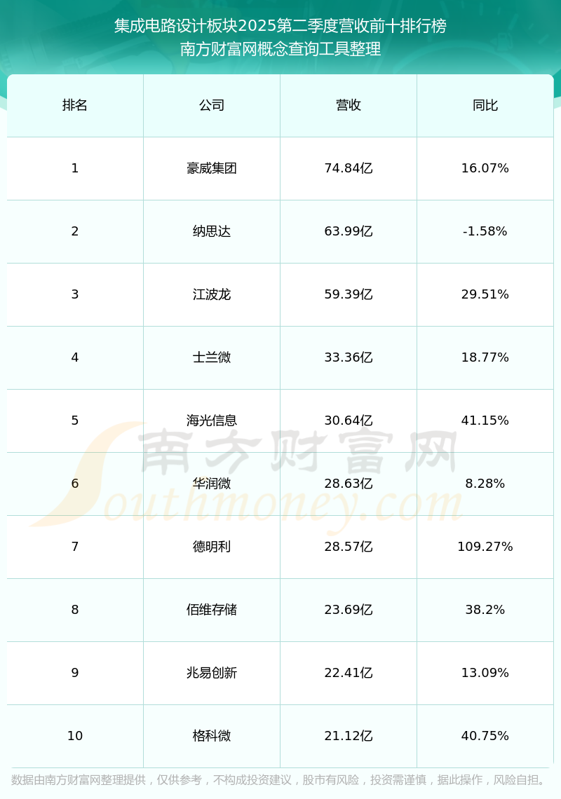 按照南方財富網(wǎng)概念查詢工具統(tǒng)計,該股所屬板塊為集成電路設計板塊,該板塊共有88只股票,芯原股份2025第二季度營收在該板塊中排名為第35名,該板塊2025第二季度營收排名前十的股票如下表: