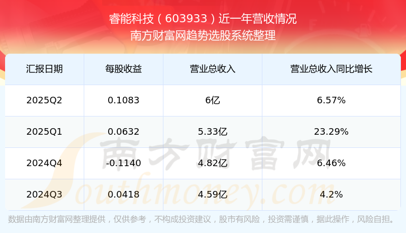 睿能科技2025年第二季度顯示,公司主營收入6億元,同比6.57%;歸母凈利潤2247.45萬元,同比-33.59%;扣非凈利潤2072.84萬元,同比-36.26%;