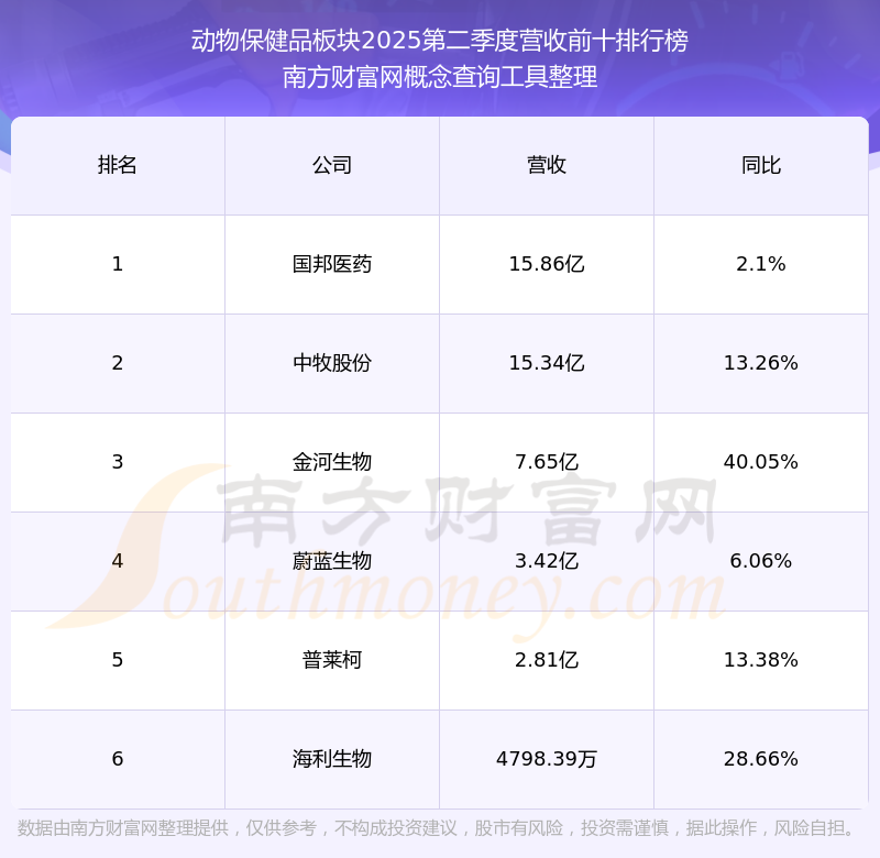 按照南方財(cái)富網(wǎng)概念查詢(xún)工具統(tǒng)計(jì),該股所屬板塊為動(dòng)物保健品板塊,該板塊共有6只股票,蔚藍(lán)生物2025第二季度營(yíng)收在該板塊中排名為第4名,該板塊2025第二季度營(yíng)收排名前十的股票如下表: