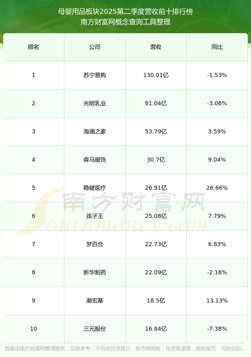 按照南方財(cái)富網(wǎng)概念查詢工具統(tǒng)計(jì),該股所屬板塊為母嬰用品板塊,該板塊共有32只股票,潤(rùn)本股份2025第二季度營(yíng)收在該板塊中排名為第32名,該板塊2025第二季度營(yíng)收排名前十的股票如下表: