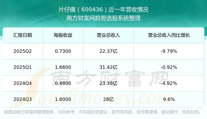按照南方財(cái)富網(wǎng)概念查詢工具統(tǒng)計(jì),該股所屬板塊為醫(yī)藥板塊,該板塊共有498只股票,片仔癀2025第二季度營(yíng)收在該板塊中排名為第56名,該板塊2025第二季度營(yíng)收排名前十的股票如下表: