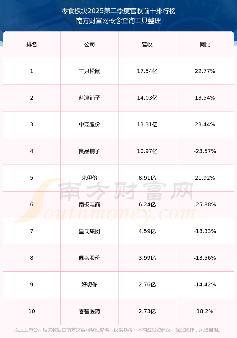 按照南方財(cái)富網(wǎng)概念查詢工具統(tǒng)計(jì),該股所屬板塊為零食板塊,該板塊共有11只股票,良品鋪?zhàn)?025第二季度營收在該板塊中排名為第4名,該板塊2025第二季度營收排名前十的股票如下表: