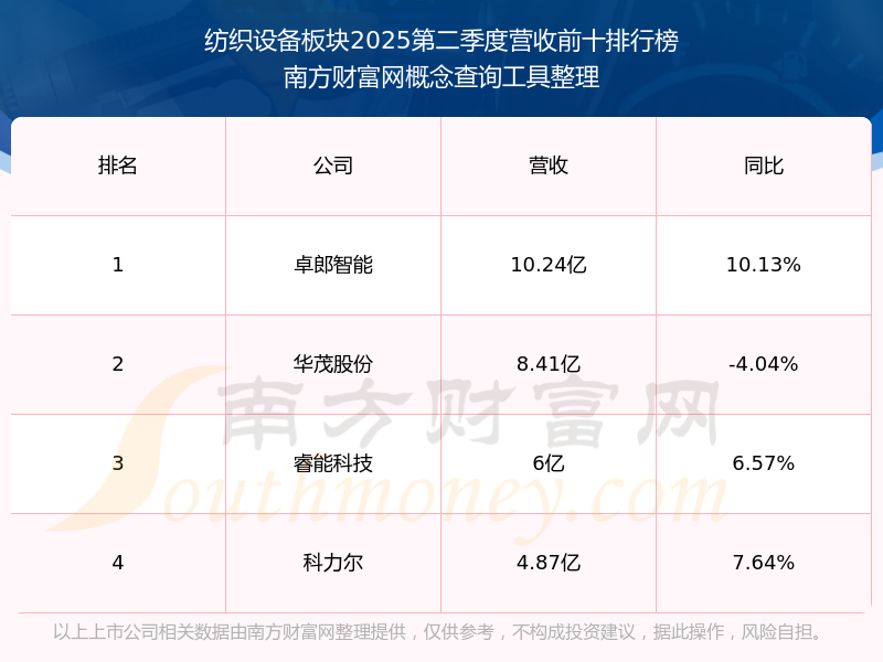 按照南方財(cái)富網(wǎng)概念查詢工具統(tǒng)計(jì),該股所屬板塊為紡織設(shè)備板塊,該板塊共有4只股票,卓郎智能2025第二季度營收在該板塊中排名為第1名,該板塊2025第二季度營收排名前十的股票如下表: