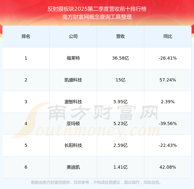 按照南方財(cái)富網(wǎng)概念查詢工具統(tǒng)計(jì),該股所屬板塊為反射膜板塊,該板塊共有6只股票,長陽科技2025第二季度營收在該板塊中排名為第5名,該板塊2025第二季度營收排名前十的股票如下表: