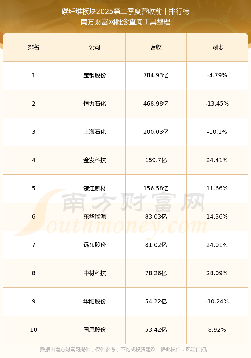 按照南方財(cái)富網(wǎng)概念查詢工具統(tǒng)計(jì),該股所屬板塊為碳纖維板塊,該板塊共有58只股票,中復(fù)神鷹2025第二季度營收在該板塊中排名為第34名,該板塊2025第二季度營收排名前十的股票如下表: