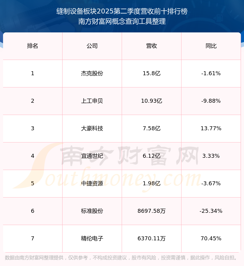 按照南方財(cái)富網(wǎng)概念查詢工具統(tǒng)計(jì),該股所屬板塊為縫制設(shè)備板塊,該板塊共有7只股票,大豪科技2025第二季度營收在該板塊中排名為第3名,該板塊2025第二季度營收排名前十的股票如下表: