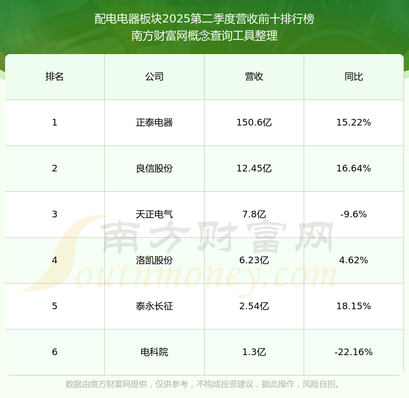 按照南方財(cái)富網(wǎng)概念查詢工具統(tǒng)計(jì),該股所屬板塊為配電電器板塊,該板塊共有6只股票,天正電氣2025第二季度營(yíng)收在該板塊中排名為第3名,該板塊2025第二季度營(yíng)收排名前十的股票如下表: