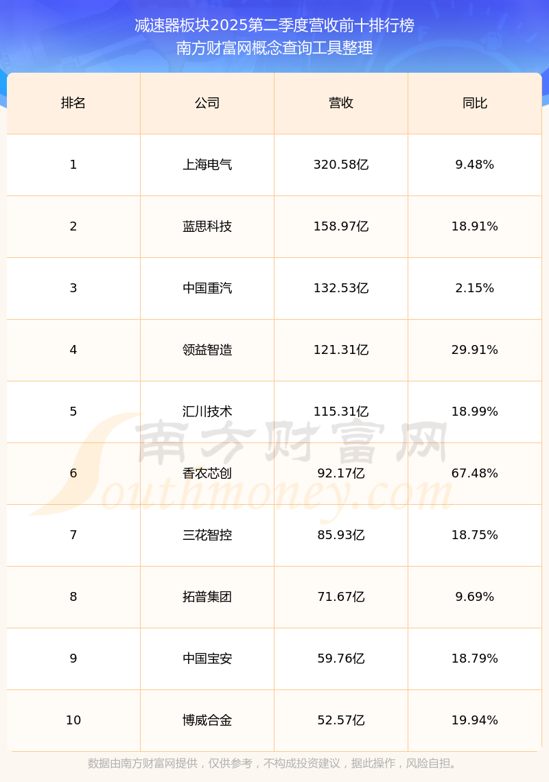 按照南方財(cái)富網(wǎng)概念查詢工具統(tǒng)計(jì),該股所屬板塊為減速器板塊,該板塊共有127只股票,中馬傳動(dòng)2025第二季度營收在該板塊中排名為第96名,該板塊2025第二季度營收排名前十的股票如下表: