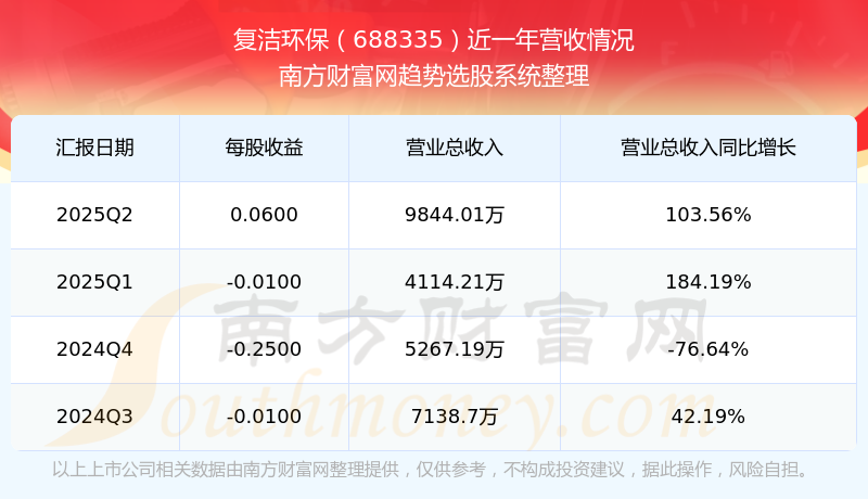 復(fù)潔環(huán)保披露了2025年第二季度財(cái)報(bào)。報(bào)告顯示,復(fù)潔環(huán)保2025年第二季度實(shí)現(xiàn)營(yíng)收9844.01萬(wàn)元,同比103.56%;歸母凈利潤(rùn)768.86萬(wàn)元,同比161.24%。