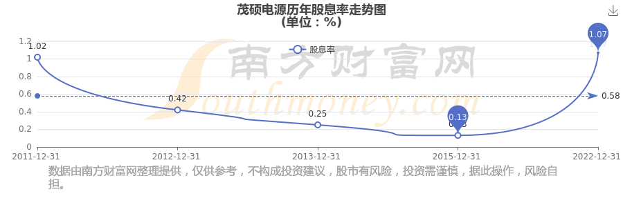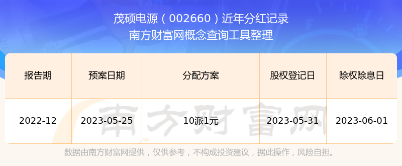 茂碩電源最新一次公布的分紅方案為10派1元。本次權(quán)益分派股權(quán)登記日為2023年5月31日,除權(quán)除息日為2023年6月1日,派息日為2023年6月1日。