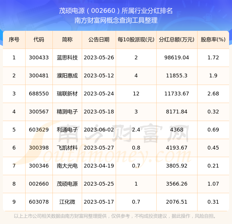 按照南方財富網(wǎng)趨勢選股系統(tǒng)統(tǒng)計,茂碩電源所屬行業(yè)為消費電子行業(yè),消費電子行業(yè)分紅排名情況如下表: