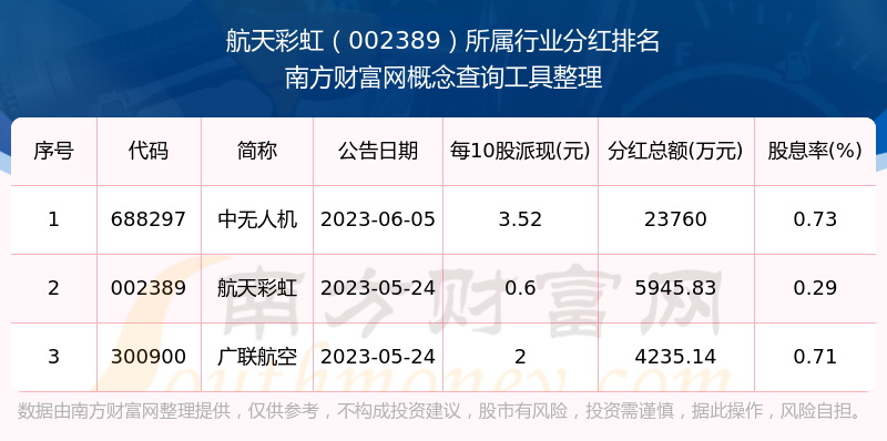 按照南方財富網(wǎng)趨勢選股系統(tǒng)統(tǒng)計,航天彩虹所屬行業(yè)為無人機行業(yè),無人機行業(yè)分紅排名情況如下表: