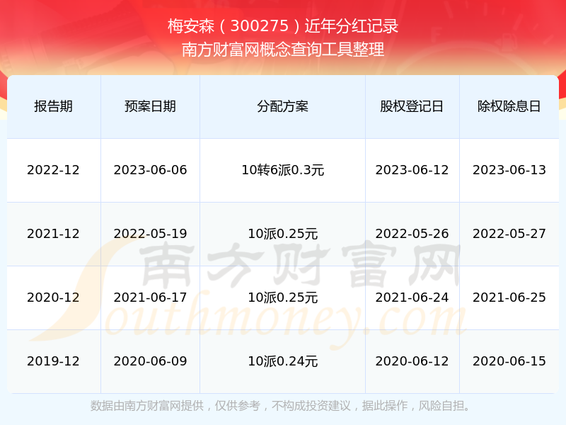 梅安森最新一次公布的分紅方案為10轉6派0.3元。本次權益分派股權登記日為2023年6月12日,除權除息日為2023年6月13日,派息日為2023年6月13日。