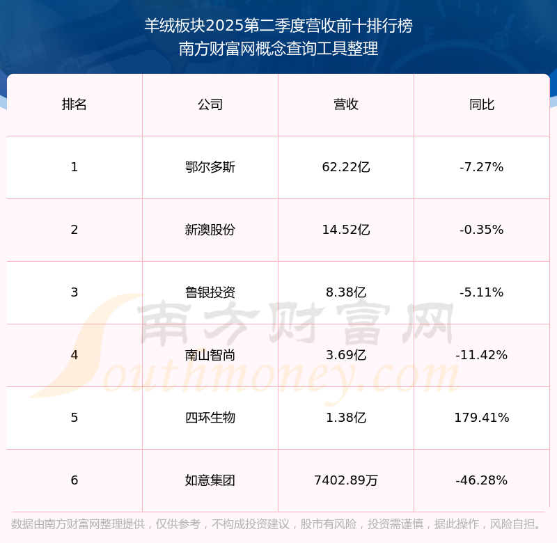 按照南方財富網概念查詢工具統(tǒng)計,該股所屬板塊為羊絨板塊,該板塊共有6只股票,新澳股份2025第二季度營收在該板塊中排名為第2名,該板塊2025第二季度營收排名前十的股票如下表: