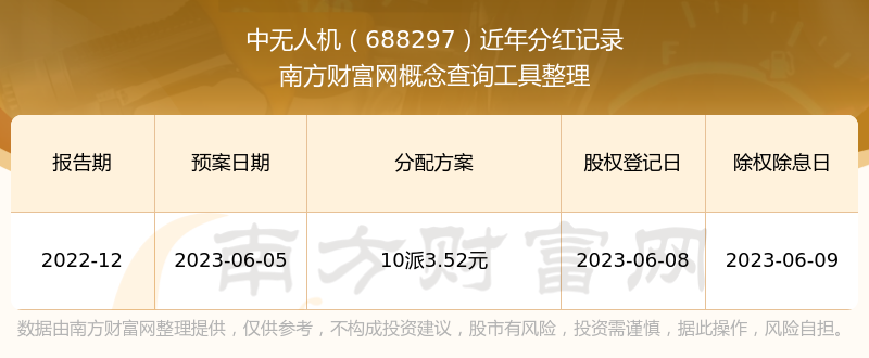 中無人機(jī)最新一次公布的分紅方案為10派3.52元。本次權(quán)益分派股權(quán)登記日為2023年6月8日,除權(quán)除息日為2023年6月9日,派息日為2023年6月9日。