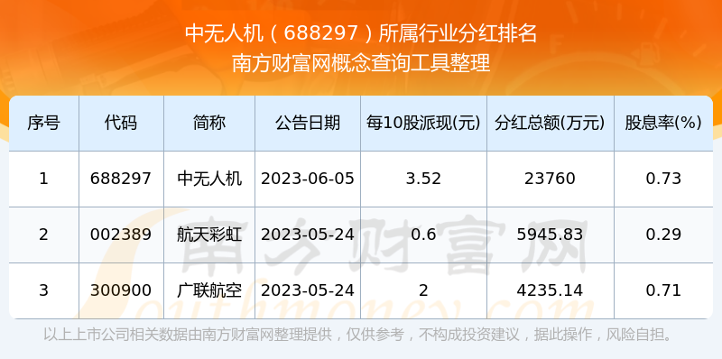 按照南方財(cái)富網(wǎng)趨勢選股系統(tǒng)統(tǒng)計(jì),中無人機(jī)所屬行業(yè)為無人機(jī)行業(yè),無人機(jī)行業(yè)分紅排名情況如下表: