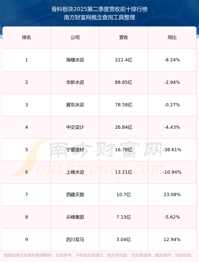 按照南方財富網(wǎng)概念查詢工具統(tǒng)計,該股所屬板塊為骨料板塊,該板塊共有9只股票,海螺水泥2025第二季度營收在該板塊中排名為第1名,該板塊2025第二季度營收排名前十的股票如下表: