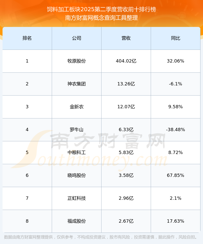 按照南方財(cái)富網(wǎng)概念查詢工具統(tǒng)計(jì),該股所屬板塊為飼料加工板塊,該板塊共有8只股票,神農(nóng)集團(tuán)2025第二季度營收在該板塊中排名為第2名,該板塊2025第二季度營收排名前十的股票如下表: