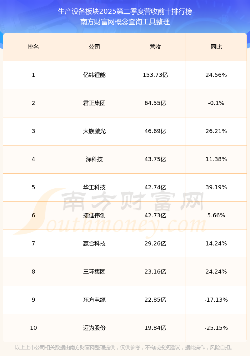 按照南方財(cái)富網(wǎng)概念查詢工具統(tǒng)計(jì),該股所屬板塊為生產(chǎn)設(shè)備板塊,該板塊共有44只股票,信宇人2025第二季度營(yíng)收在該板塊中排名為第44名,該板塊2025第二季度營(yíng)收排名前十的股票如下表: