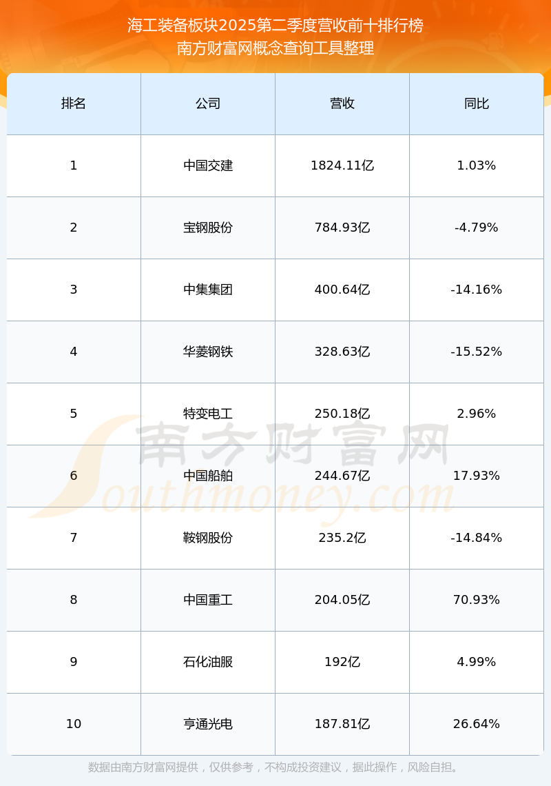 按照南方財富網(wǎng)概念查詢工具統(tǒng)計,該股所屬板塊為海工裝備板塊,該板塊共有143只股票,中國動力2025第二季度營收在該板塊中排名為第11名,該板塊2025第二季度營收排名前十的股票如下表: