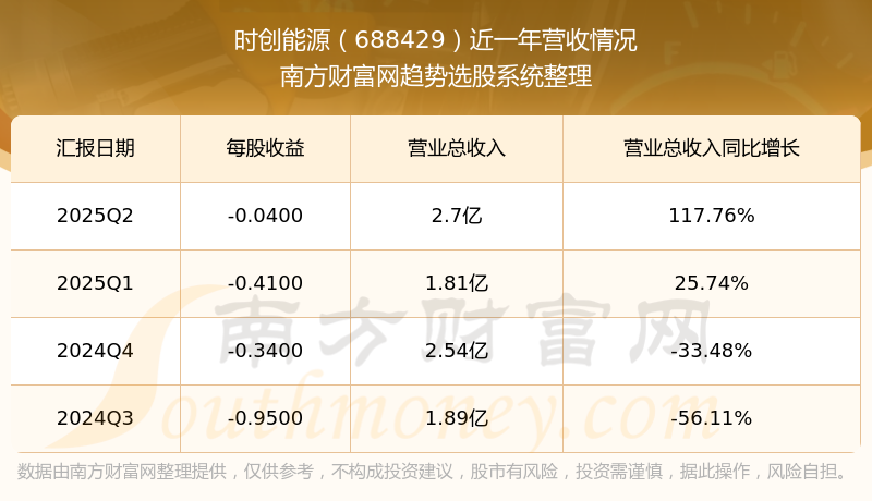 時(shí)創(chuàng)能源2025年第二季度顯示,公司主營收入2.7億元,同比117.76%;歸母凈利潤-1506.71萬元,同比79.87%;扣非凈利潤-1129.78萬元,同比84.42%。