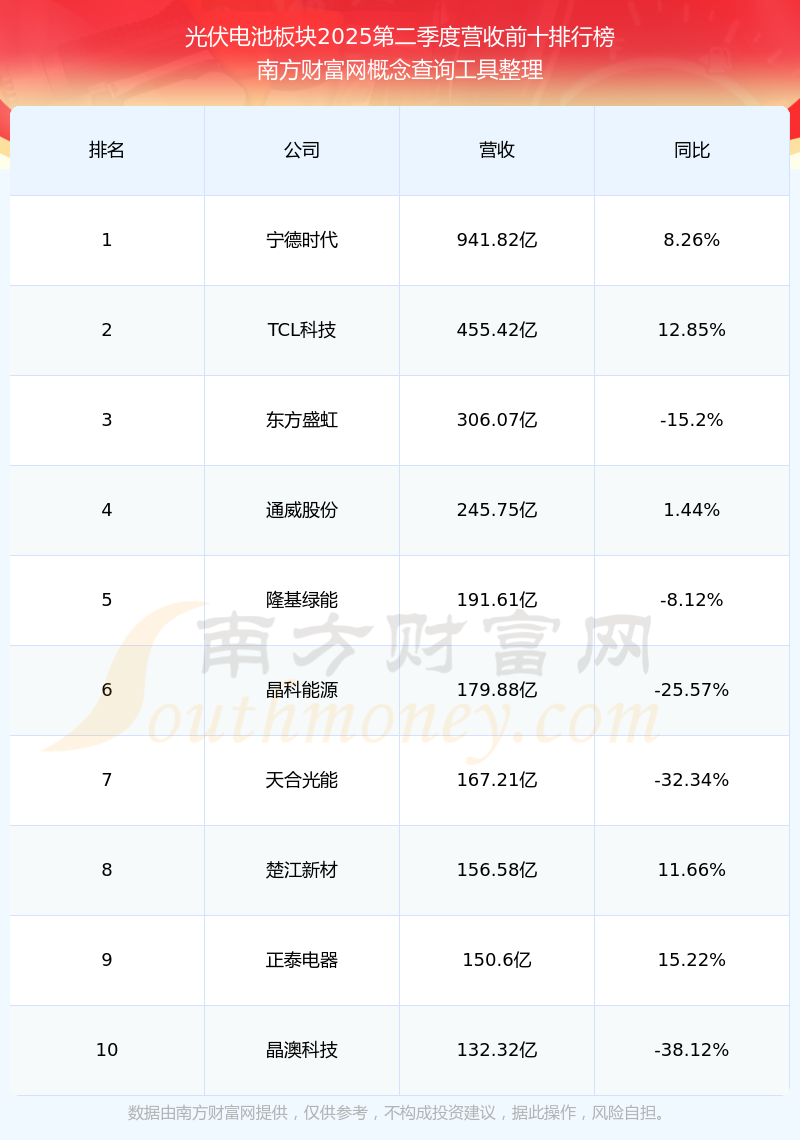 按照南方財(cái)富網(wǎng)概念查詢工具統(tǒng)計(jì),該股所屬板塊為光伏電池板塊,該板塊共有74只股票,時(shí)創(chuàng)能源2025第二季度營收在該板塊中排名為第74名,該板塊2025第二季度營收排名前十的股票如下表: