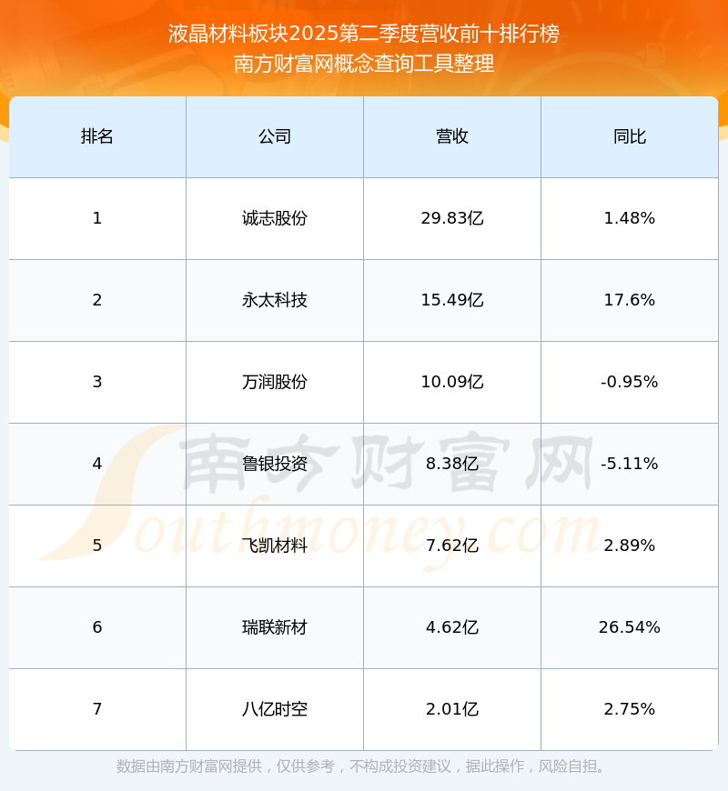 按照南方財富網(wǎng)概念查詢工具統(tǒng)計,該股所屬板塊為液晶材料板塊,該板塊共有7只股票,八億時空2025第二季度營收在該板塊中排名為第7名,該板塊2025第二季度營收排名前十的股票如下表: