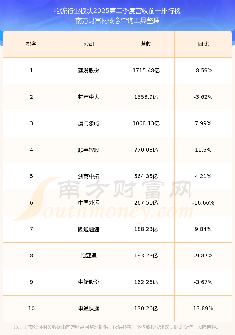 按照南方財(cái)富網(wǎng)概念查詢工具統(tǒng)計(jì),該股所屬板塊為物流行業(yè)板塊,該板塊共有57只股票,華貿(mào)物流2025第二季度營收在該板塊中排名為第17名,該板塊2025第二季度營收排名前十的股票如下表: