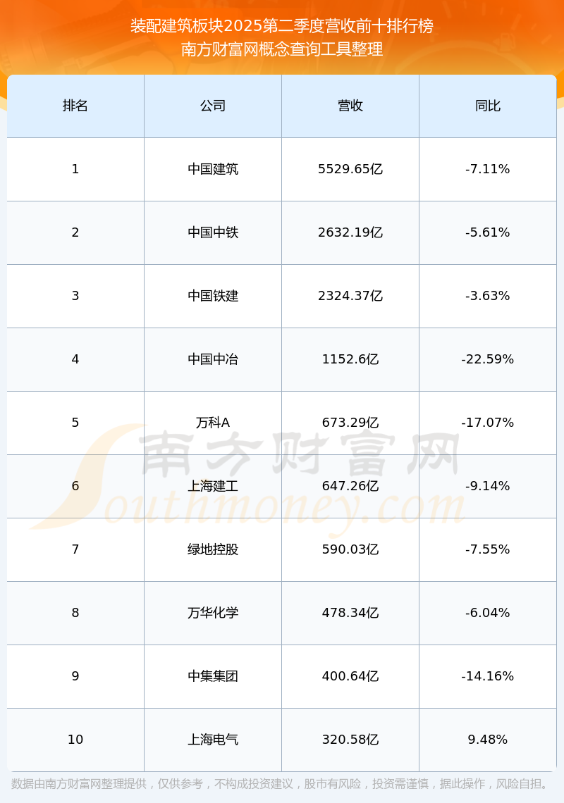 按照南方財(cái)富網(wǎng)概念查詢工具統(tǒng)計(jì),該股所屬板塊為裝配建筑板塊,該板塊共有92只股票,騰達(dá)建設(shè)2025第二季度營(yíng)收在該板塊中排名為第92名,該板塊2025第二季度營(yíng)收排名前十的股票如下表: