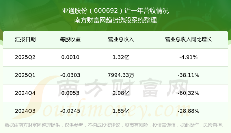 亞通股份2025年第二季度顯示,公司主營收入1.32億元,同比-4.91%;歸母凈利潤34.01萬元,同比-97.4%;扣非凈利潤-4.68萬元,同比98.4%。