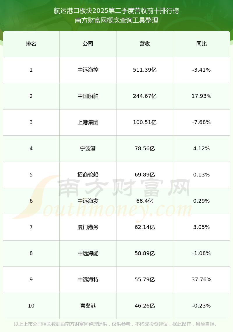 按照南方財(cái)富網(wǎng)概念查詢工具統(tǒng)計(jì),該股所屬板塊為航運(yùn)港口板塊,該板塊共有41只股票,唐山港2025第二季度營(yíng)收在該板塊中排名為第25名,該板塊2025第二季度營(yíng)收排名前十的股票如下表: