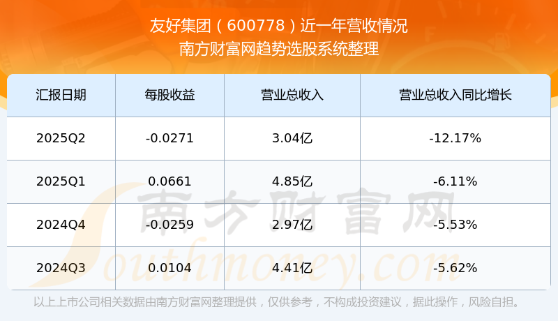 財報顯示,2025年第二季度友好集團營收3.04億元,同比增長-12.17%,凈利潤-844.49萬元,同比增長-51.63%。