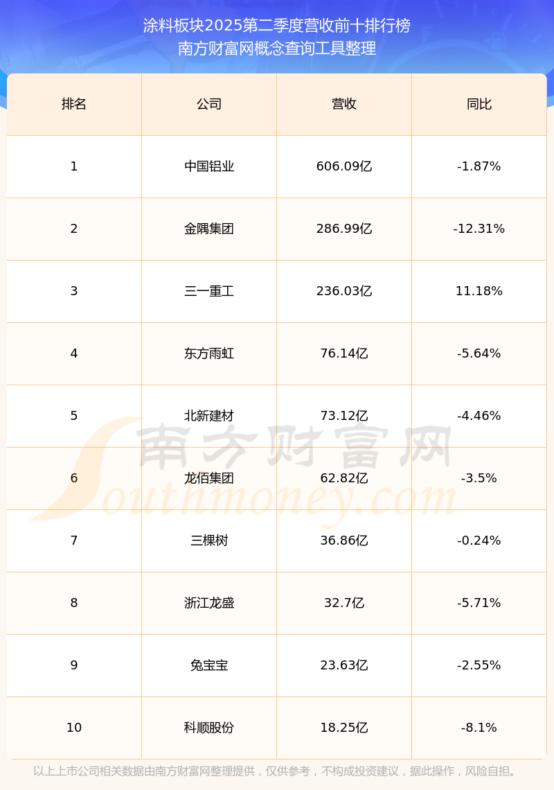 按照南方財(cái)富網(wǎng)概念查詢工具統(tǒng)計(jì),該股所屬板塊為涂料板塊,該板塊共有44只股票,吉華集團(tuán)2025第二季度營(yíng)收在該板塊中排名為第28名,該板塊2025第二季度營(yíng)收排名前十的股票如下表: