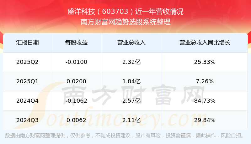 盛洋科技2025年第二季度財(cái)報(bào)顯示,公司主營(yíng)收入2.32億元,同比25.33%;歸母凈利潤(rùn)-122.38萬(wàn)元,同比-186.33%;扣非凈利潤(rùn)-390.45萬(wàn)元,同比-433.44%。
