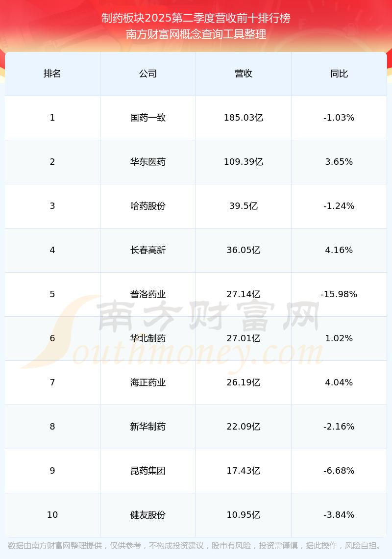按照南方財富網(wǎng)概念查詢工具統(tǒng)計,該股所屬板塊為制藥板塊,該板塊共有57只股票,復(fù)星醫(yī)藥2025第二季度營收在該板塊中排名為第57名,該板塊2025第二季度營收排名前十的股票如下表:
