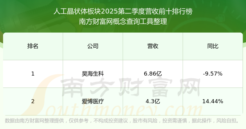 按照南方財富網(wǎng)概念查詢工具統(tǒng)計,該股所屬板塊為人工晶狀體板塊,該板塊共有2只股票,愛博醫(yī)療2025第二季度營收在該板塊中排名為第2名,該板塊2025第二季度營收排名前十的股票如下表: