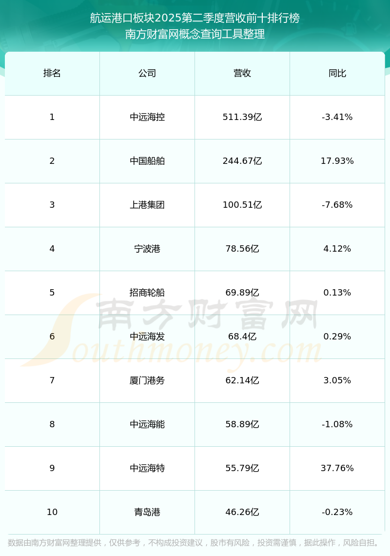 按照南方財(cái)富網(wǎng)概念查詢工具統(tǒng)計(jì),該股所屬板塊為航運(yùn)港口板塊,該板塊共有41只股票,日照港2025第二季度營(yíng)收在該板塊中排名為第18名,該板塊2025第二季度營(yíng)收排名前十的股票如下表: