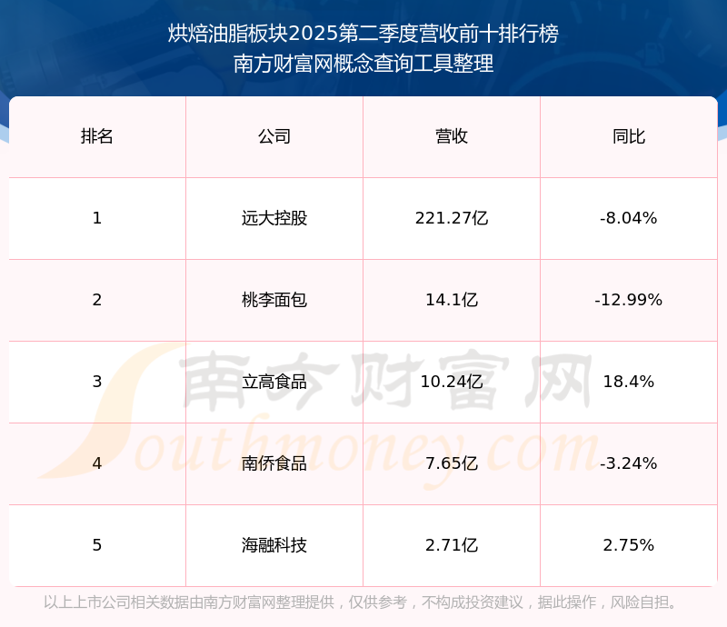 按照南方財富網(wǎng)概念查詢工具統(tǒng)計,該股所屬板塊為烘焙油脂板塊,該板塊共有5只股票,南僑食品2025第二季度營收在該板塊中排名為第4名,該板塊2025第二季度營收排名前十的股票如下表: